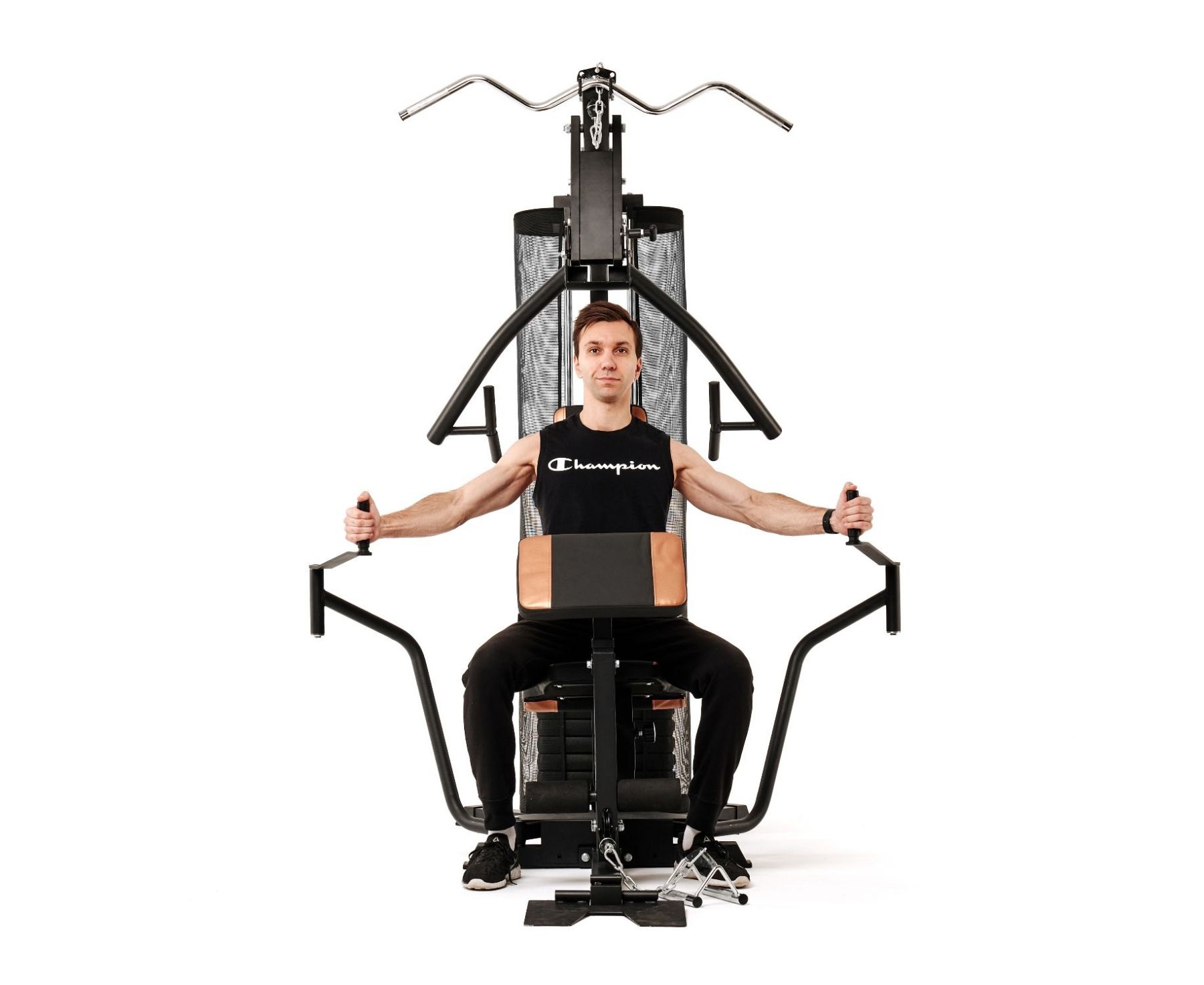 4. Баттерфляй. Используется для тренировки большой грудной мышцы (в том числе стернального участка), малой грудной и мышц ключичного отдела, а также мышц рук: бицепс, трицепс, брахиалис, лучевой разгибатель кисти. Максимальная нагрузка — 130 кг.