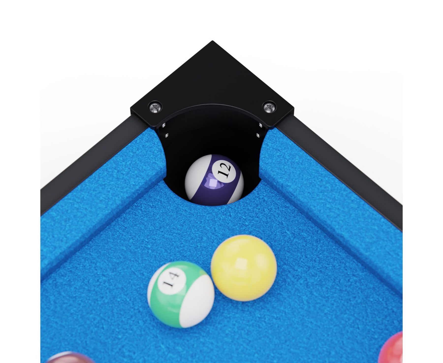 Диаметр шара — 25 мм, длина кия — 45,7 см. Размеры идеально адаптированы для настольного формата, сохраняя при этом атмосферу классического бильярда. В набор входят 2 кия, комплект шаров, треугольник для их расстановки и мел. Всё необходимое уже включено, поэтому можно сразу приступать к игре.