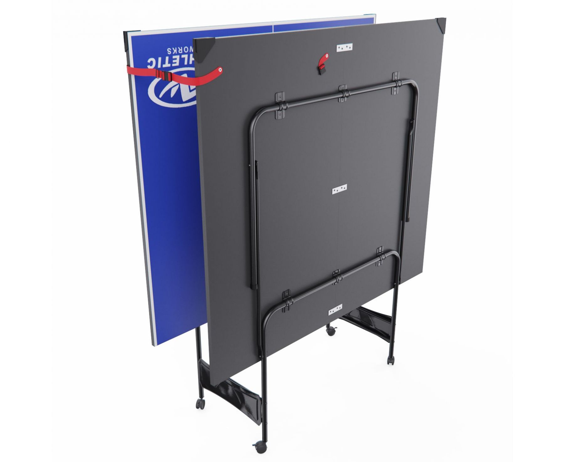 Конструкция стола состоит из 4-х частей, при этом стол складывается наполовину, что позволяет играть в одиночку и экономит место при хранении. В сложенном виде он занимает минимум места, что делает хранение и транспортировку максимально удобными. Для удобства перемещения стол оснащён четырьмя транспортировочными роликами с фиксаторами. Это позволяет легко перемещать его по дому или площадке и надёжно фиксировать в нужном положении.