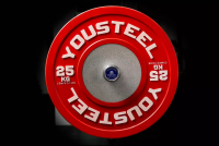 Отличительной особенностью этих блинов является невероятно малая погрешность по весу - всего 0,1%. Такая погрешность позволяет использовать эти диски для проведения соревнований по тяжелой атлетики. В отличии от тренировочных каучуковых дисков, мы использовали металлический диск в центре блина. Это позволило сделать диски тоньше, соответственно, их больше поместится на олимпийский гриф. Для простоты ориентации диск цветной.