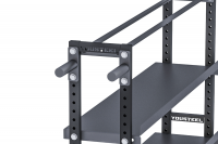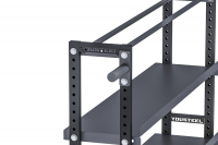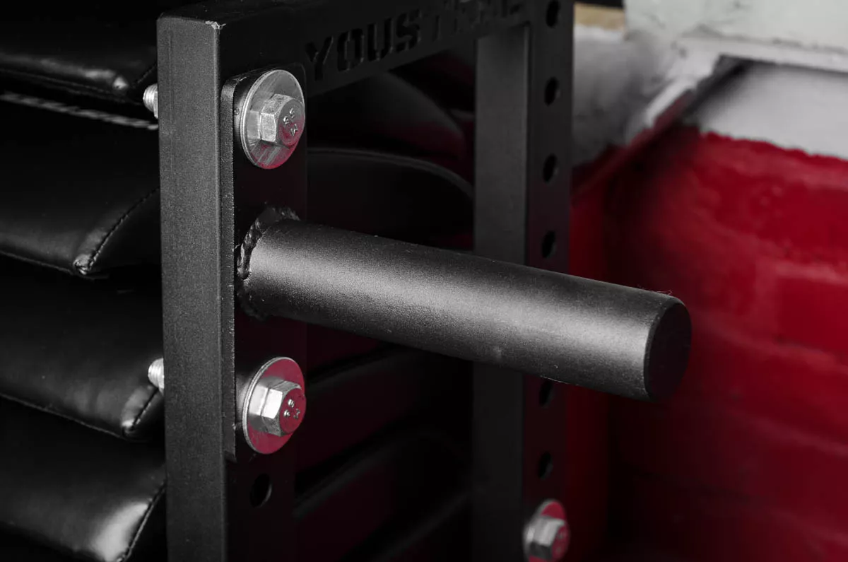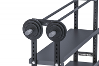 Он устанавливается на любой высоте на стойке рамы, стойке стеллажа или в стену. Крепиться 2 болтами. Место крепления к раме покрашено порошковой краской, как сама рама. Место по диски оцинкованное, чтобы поверхность не царапалась. Длина: 220мм. Максимальная нагрузка: 150кг. Диаметр трубы – 48 мм и подходит для всех дисков олимпийского стандарта.