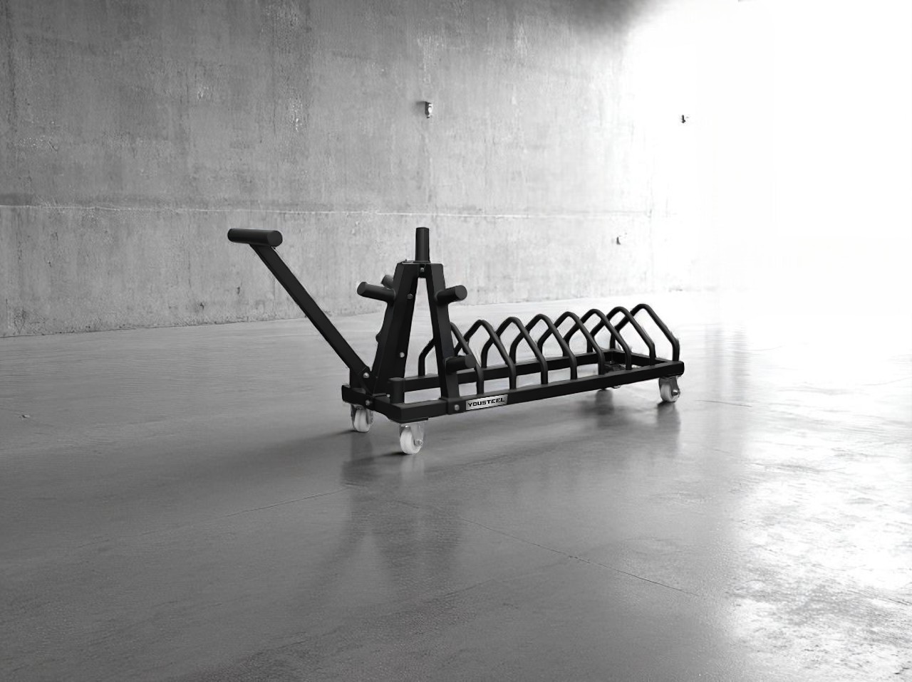 Подставка для дисков на колёсах - предназначена для удобного перемещения и хранения дисков для штанги. Отлично подходит для проведении соревнований и при тренировках с большими весами. Снабжена длинной ручкой и четырьмя транспортировочными колёсами, позволяющими легко передвигать комплект блинов весом до 400 кг.