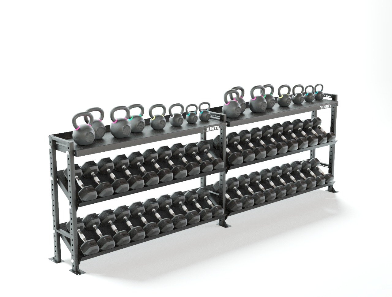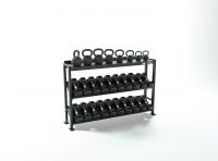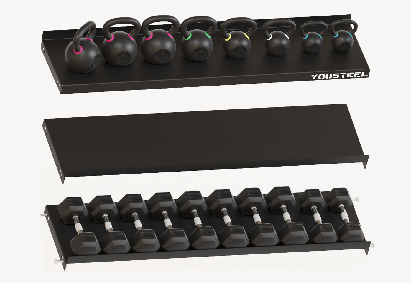 Полка стеллажа 1800мм - это универсальный элемент стеллажа, созданный для организации пространства хранения гирь/гантелей и прочего оборудования, которое можно разместить на плоской поверхности. Данная полка может быть установлена как горизонтально, что даст ровную плоскую поверхность, так и под наклоном, что даст удобное пространство для хранения гантелей, с упором под передний край.