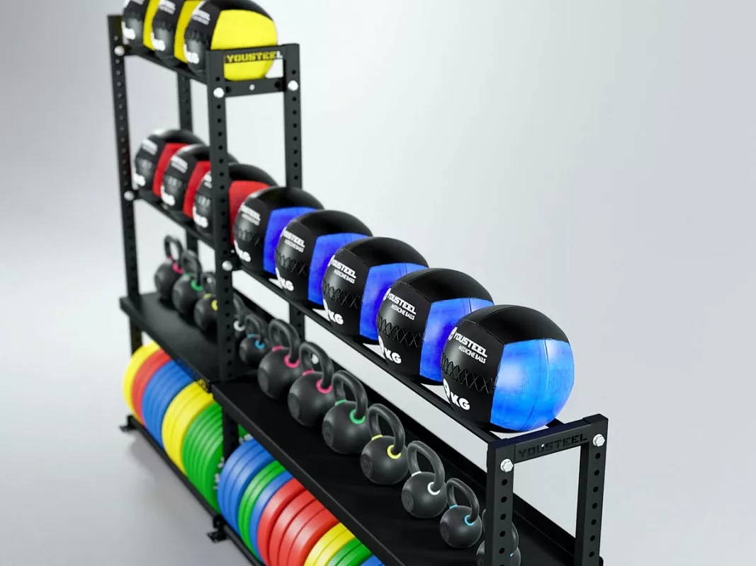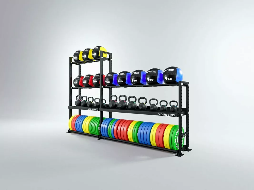 Модульные стеллажи YOUSTEEL – универсальное и простое решение по организации эффективного хранения вашего оборудования в зале. Они отлично вписываются в интерьер любого спортивного зала. Стеллаж YOUSTEEL изготавливаются из стали толщиной 3 мм, поверхность покрыта порошковой краской.
