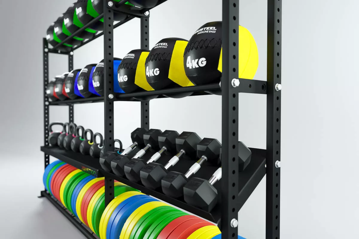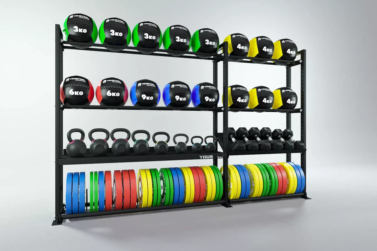 Модульные стеллажи YOUSTEEL – универсальное и простое решение по организации эффективного хранения вашего оборудования в зале. Они отлично вписываются в интерьер любого спортивного зала. Стеллаж YOUSTEEL изготавливаются из стали толщиной 3 мм, поверхность покрыта порошковой краской.