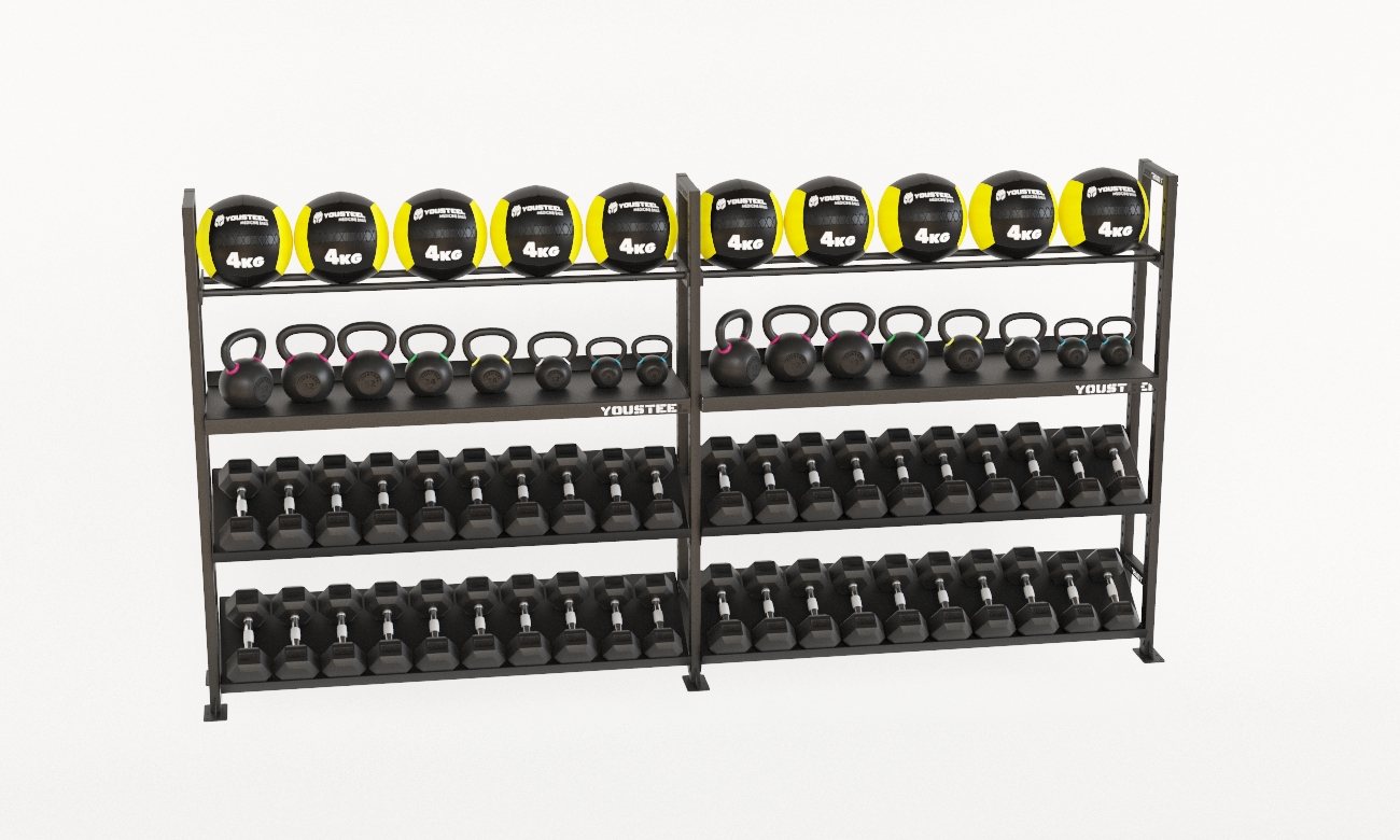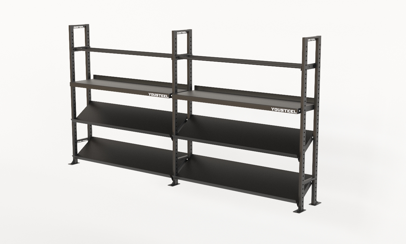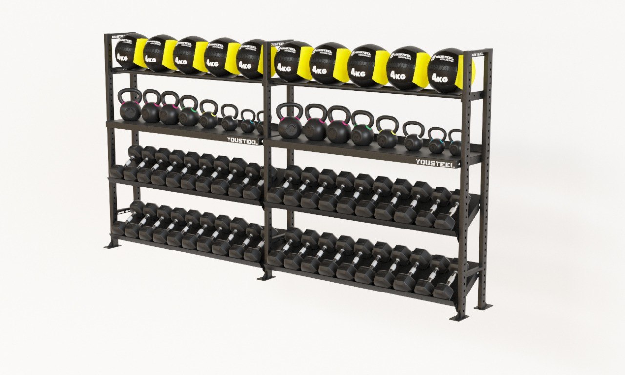 Модульные стеллажи YOUSTEEL – универсальное и простое решение по организации эффективного хранения вашего оборудования в зале. Они отлично вписываются в интерьер любого спортивного зала. Стеллаж YOUSTEEL изготавливаются из стали толщиной 3 мм, поверхность покрыта порошковой краской.