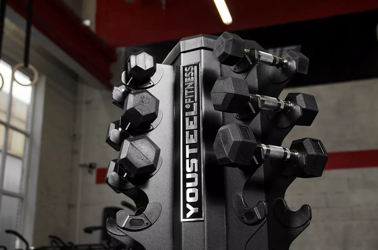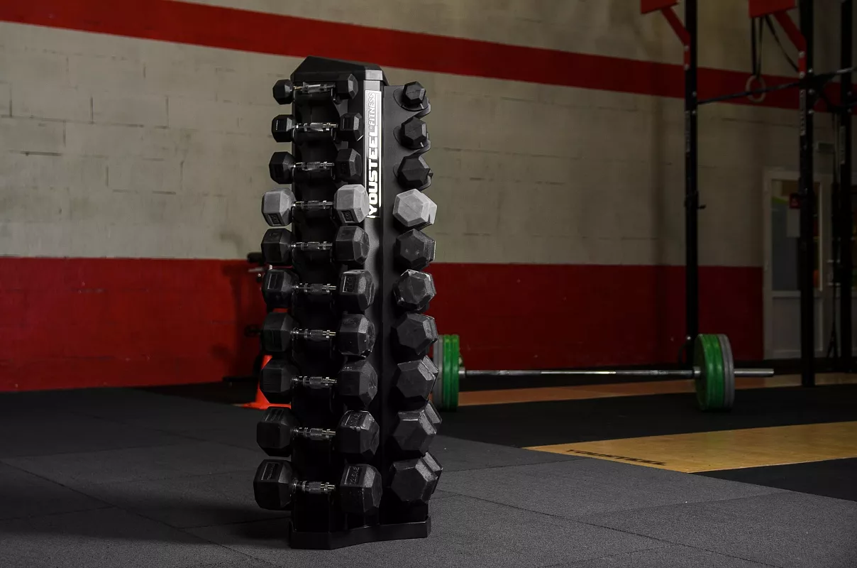 Стойка способна вместить 10 пар гантелей, весом от 1 до 10кг. Ложементы обрамлены пластиком и предотвратят повреждения рукоятей гантелей. Это отличный компактный вариант с габаритными размерами 450х257х1387мм