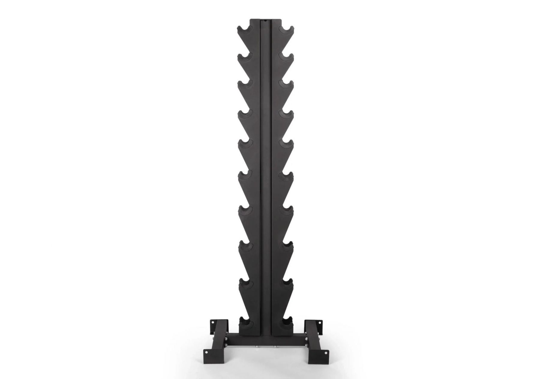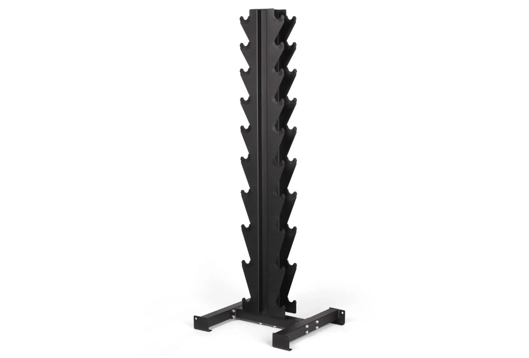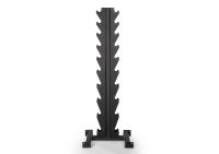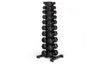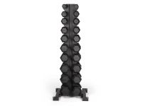 Стойка способна вместить 10 пар гантелей, весом от 1 до 10кг. Ложементы обрамлены пластиком и предотвратят повреждения рукоятей гантелей. Габаритные размеры изделия: 510x510x1550мм. Вес: 21кг.